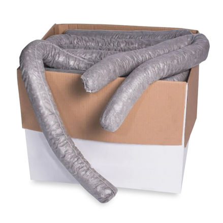 Universal socks are tubular absorbents, available in various lengths, that are great for surrounding drums and machinery to contain and absorb non-aggressive fluids, such as oil, water, glycols, etc. Filled with shredded post-industrial fiber waste, fluid penetrates one section and spreads throughout the length of the sock (not for use with aggressive chemicals, such as acids and bases).